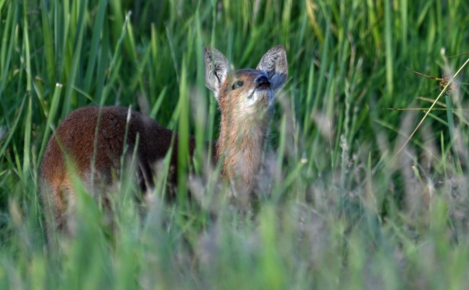 The most frequently observed behaviours were staring and fleeing, recorded 942 and 915 times, respectively, and together these were clearly the dominant vigilant strategy. The FID ranged from 0 to 10.6 m (35 ft.), with a mean of 2.4 m (8 ft.) and, broadly speaking, older fawns (9-18 weeks) had a lower FIDs than younger ones (1-8 weeks) - those less than a week old did not flee as is expected in newborns. The roar/vocalisation was only heard twice, both times in fawns less than three weeks old, while neck stretching and vigilant pawing developed at around 10 weeks old. Indeed, as the fawns grew older their vigilance behaviour became more complex, with just shy of 41% of behaviours explained by the fawn's age, while the presence of another deer, the direction of the observer's approach, and the presence of shelter each accounted for no more than 5% of the responses. In other words, as fawns aged they incorporated different combinations of behaviours and older fawns tended to exhibit more behaviours during any given approach (i.e., had more decision-making chains), presumably as the fawns' experience of risk assessment increased. Interestingly, unlike some other studies that have found animals in general fear human eye contact, the researchers found no significant influence of observer eye contact on the fawns' decisions or behaviour, noting that "Chinese water deer perceived threat sources more holistically, sometimes fleeing without seeing the human's eyes".
