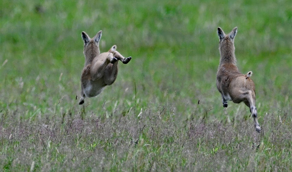 Water deer are behaviourally similar to hares in that, when faced with danger, they will duck low in cover and remain quiet and motionless, before erupting away at the last minute. John Heathcote, who manages the Claxton Manor estate in Norfolk, told me that water deer are the only species he knows that can be disturbed standing on the edge of a copse and flee away from the trees rather than into them, something I have also observed. On two occasions, both with does (females), I observed a deer to "pseudo-graze" -- where the deer spots something suspicious and puts its head down "pretending" to feed, an action that might make a predator think it's not been spotted and therefore move, but while keeping their eyes fixed on the source -- which is a behaviour I have hitherto only come across in roe deer (Capreolus capreolus). In common with other deer, although much less conspicuous owing to its size and lack of rump markings, a fleeing water deer will sometimes hold its tail upright (known as "tail flagging"). They will often also kick out with their hind feet in what might be an anti-predator behaviour (i.e., kicking sharp hooves at whatever's in pursuit). Tail flagging and rear-kicking may occur simultaneously and are behaviours I have observed both in adults and in fawns at four or five weeks old.
