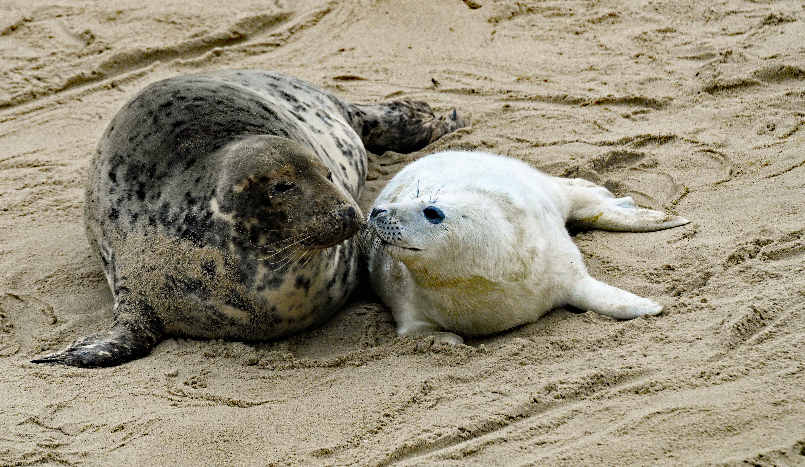 Appearance: The grey seal is a medium-sized, robustly built pinniped. The head is rectangular, and the long, convex muzzle -- often described as a "Roman nose" -- lends the animal an almost horse-like profile. A fleshy area around the whisker pad partly obscures the lower jaw. The eyes are small relative to the head and widely set, positioned towards the top of the skull alongside the nostrils, enabling the seal to use both senses while only minimally breaking the surface. A reliable diagnostic feature separating this species from the common seal (Phoca vitulina) is the arrangement of the nostrils: in the grey seal these are parallel and widely spaced, forming a W-shape when viewed head-on, whereas in the common seal they converge to form a V. The fore-flippers are short and broad. Coat colouration is highly variable, ranging from largely white with black or grey markings through to uniform dark grey or black.