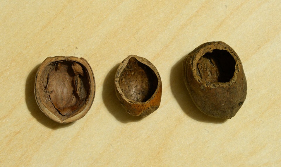 So, when you're out and about, what should you be looking for to know whether there are wood mice in the area? Well, checking in crevices and hollows for discarded nuts and seeds is a good start. Wood mice feed by holding the nut against the ground and gnawing into (usually) the top with their lower teeth, working away at the side furthest from the body. The lower teeth work against the upper incisors, which grip the nut on the outside rim. The result is that a rather irregular hole is gnawed into the nut, which has a very distinct corrugated edge to it, because the teeth scrape at 90-degrees to the edge of the hole; chip marks caused by the upper incisors can be seen around the outside of the hole. The mouse is after the kernel inside the shell and will chip it out through the hole it gnaws in the outer shell.